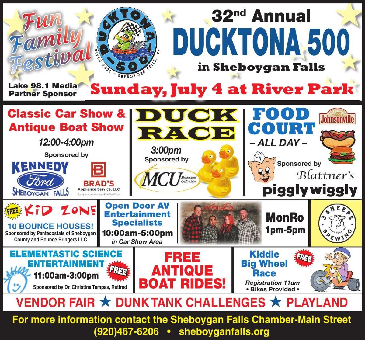 Or contact the Chamber-Main Street 920-467-6206. Enjoy the family festival with live music food court vendor. Ducktona 500 Family Festival and 32nd Annual Ducktona 500 Car Show Antique Boat Show Bring the entire family to beautiful River Park in Sheboygan Falls.